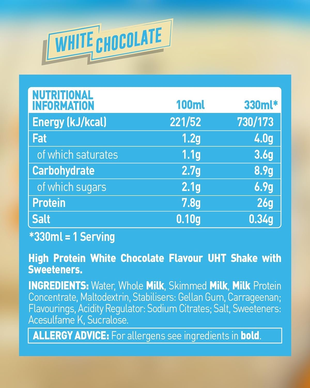 Such a great protein shake! The white chocolate is rich and creamy, with no weird aftertaste. Each bottle is the perfect size (330ml), and the 8-pack is convenient for stocking up.